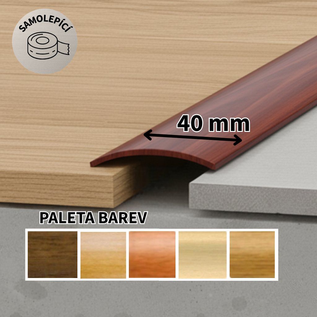 Přechodové lišty samolepící, šíře 40 mm a maximální nivelace 10 mm. Povrch je folie imitující dřevo.