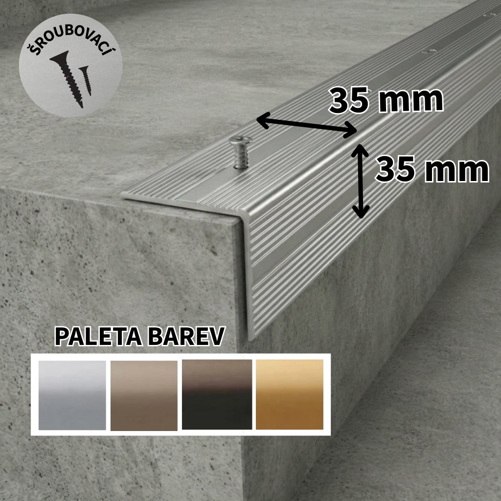 Schodový profil z eloxovaného hliníku, v rozměru 35×35 mm, šroubovací. Dodáváno vč. šroubů.