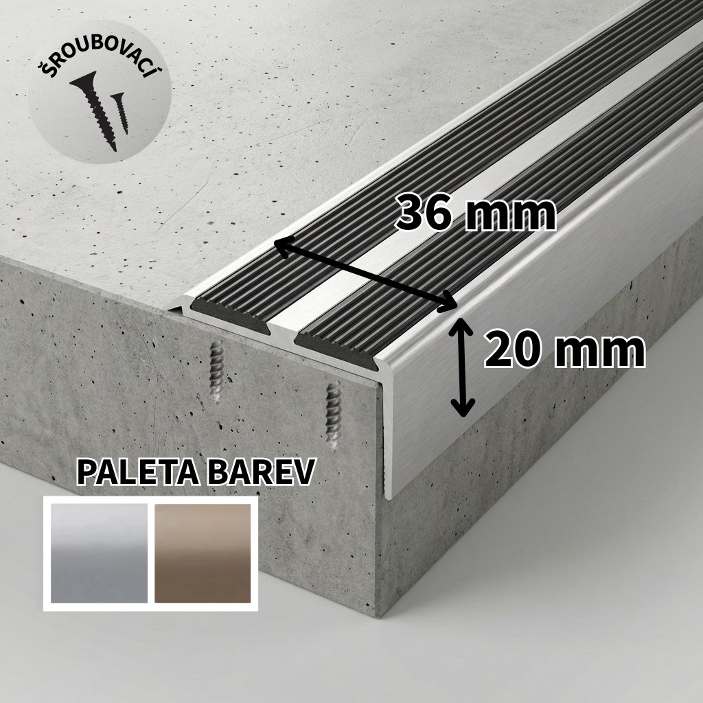 Schodový profil s dvojitou PVC černou páskou v rozměru 36x20 mm. Slouží k ukončení podlahového materiálu. Lišty jsou vhodné k použití v komerčních interiérech a bytových prostorách. Dodáváno vč. šroubů.