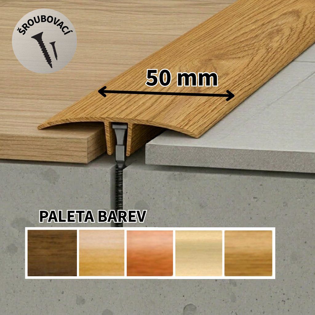 Přechodové lišty na trn, s nivelací max. 16 mm, v šíři 50 mm, balené vč. příslušenství.