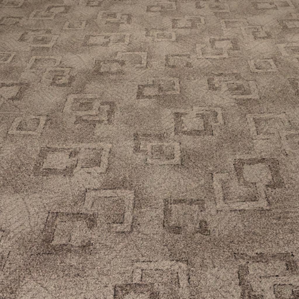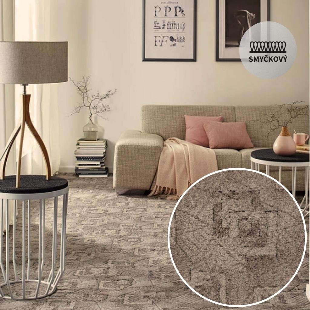 (B) Smyčkový metrážový "scroll" koberec. Scroll je systém výroby utažených a povolených smyček, které vytváří 3D efekt. Koberec je vyroben z polyamidového vlákna, na kterém je jemný potisk grafických vzorů. Použité vlákno je stálobarevné a patří mezi oblíbené díky jednoduché údržbě. Podklad Ultratex (filc) tvoří rubovou stranu koberce.