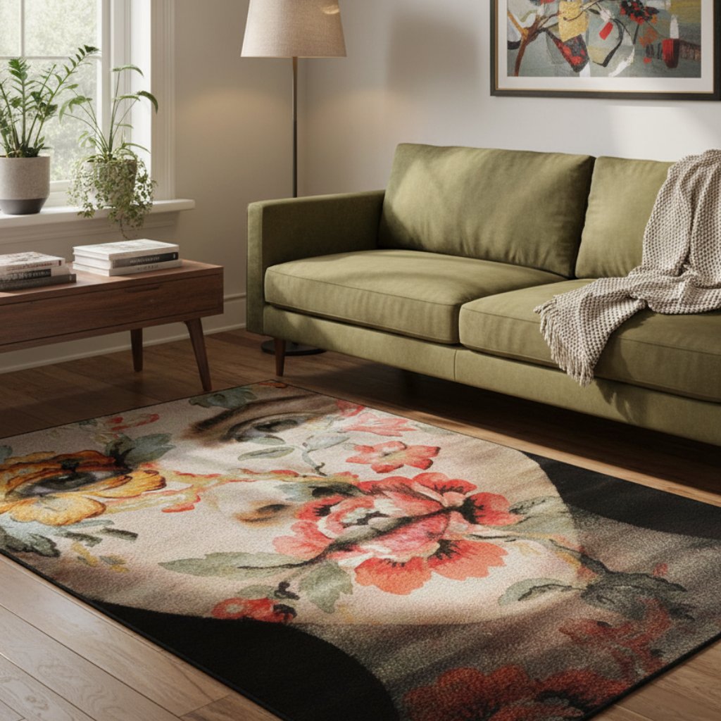 Moderní provedení kusového koberce s portrétem ženské tváře zahalené v květinách ocení milovníci netypických děl.