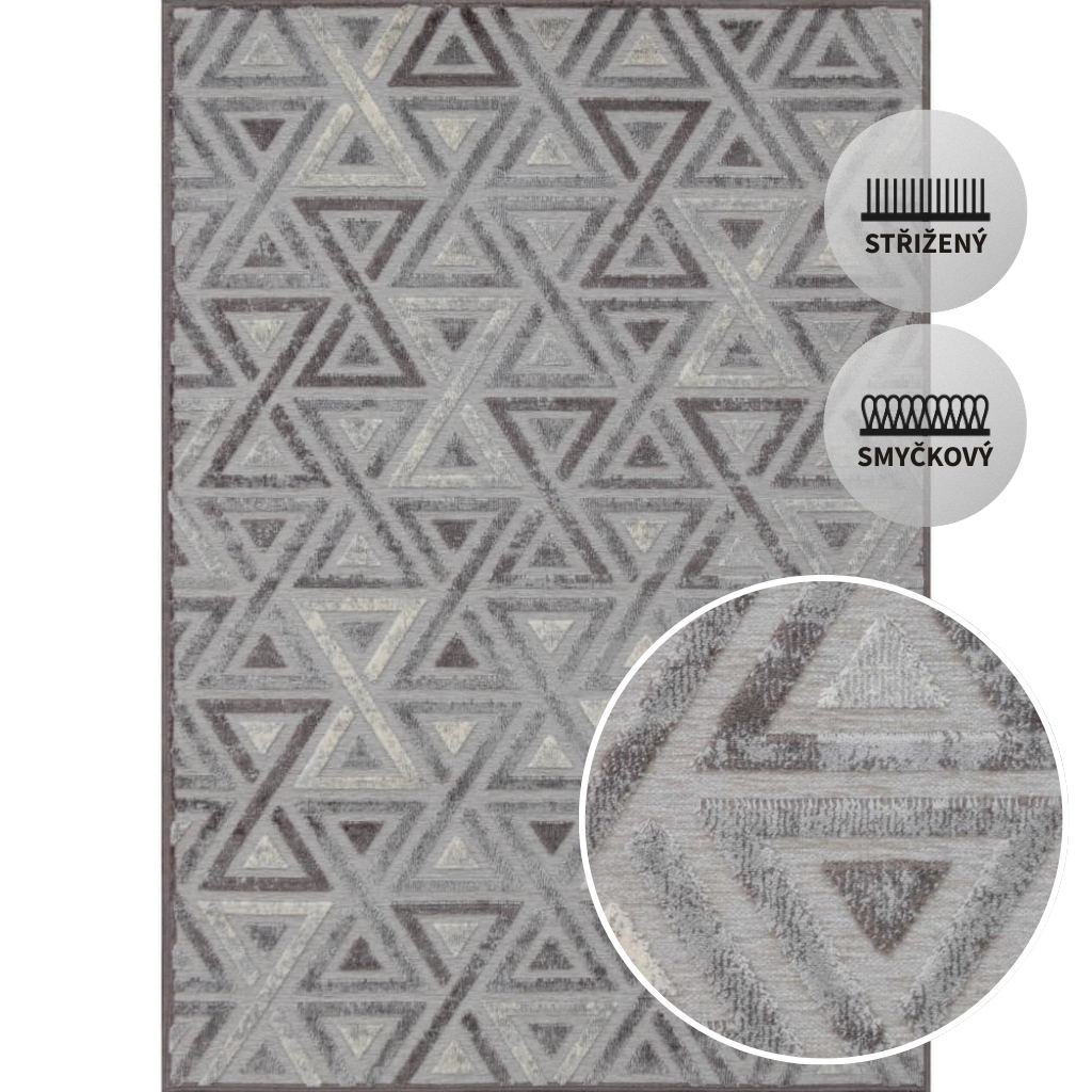 Luxusní kusový koberec RAGUSA v sofistikovaném spojení stříbrných a krémových tónů dodá interiéru výraz noblesy a moderního šarmu. Plastický motiv trojůhelníků, vystupující z šedého podkladu, vytváří působivý vizuální efekt a přirozeně přitahuje pozornost. Tento elegantní koberec se stane výrazným designovým prvkem, který podtrhne styl vašeho domova a vnese do prostoru pocit exkluzivity a vytříbeného vkusu.