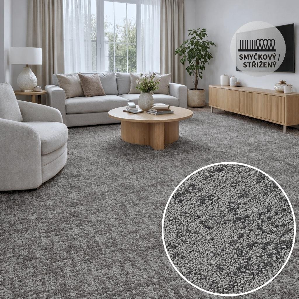 Jednobarevné vlákno je zpracováno do kombinace smyček a střiženého vlasu (cut & loop), což vytváří jemný plastický vzor a dodává koberci elegantní, až luxusní vzhled, aniž by byl nápadný nebo rušivý. Tento typ struktury navíc pomáhá rozbít plochu a skrýt drobné stopy provozu.