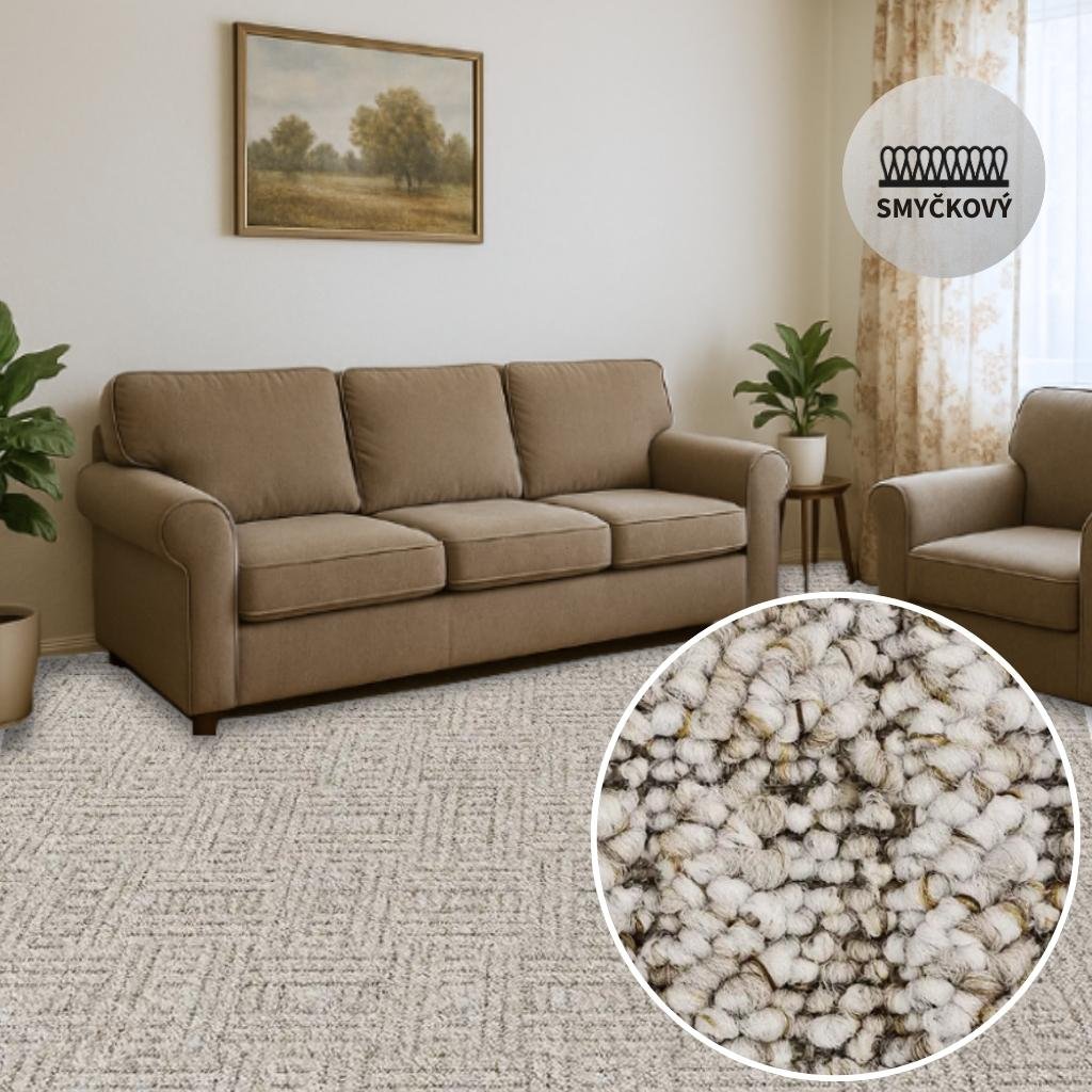 Kvalitní metrážový koberec SPARTA s 3D zajímavým vzorem je originální smyčkový koberec. Ozdobí váš obývací pokoj nebo pokoj pro hosty..