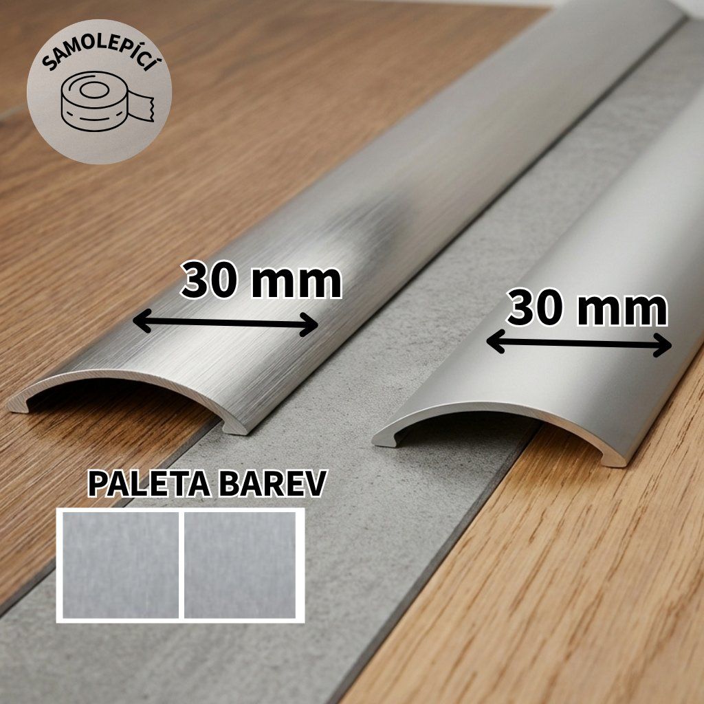 Podlahové lišty hliníkové, samolepící, s max. nivelací 5 mm. Šíře 30 mm, imitující dřevo. Slouží k ukončení, nebo k plynulému přechodu mezi různými podlahovými materiály s max. nivelací 5 mm, např. koberec - marmoleum.