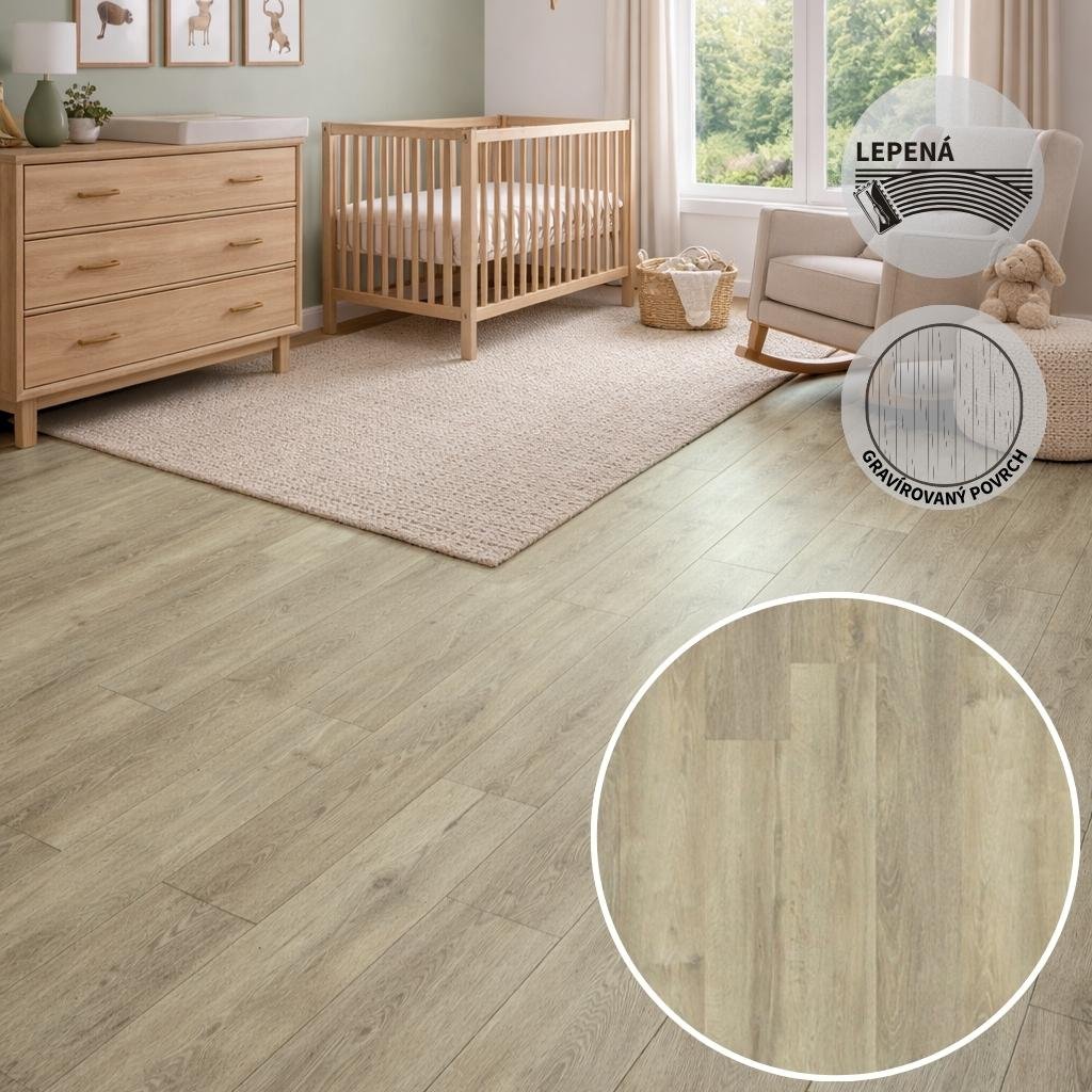Výhodou je také nízká konstrukční výška (2 mm) – hodí se při rekonstrukcích, když potřebujete udržet nízké přechody. A pokud máte podlahové topení, tenký vinyl dobře předává teplo do místnosti. Povrchová úprava navíc usnadňuje běžnou údržbu.