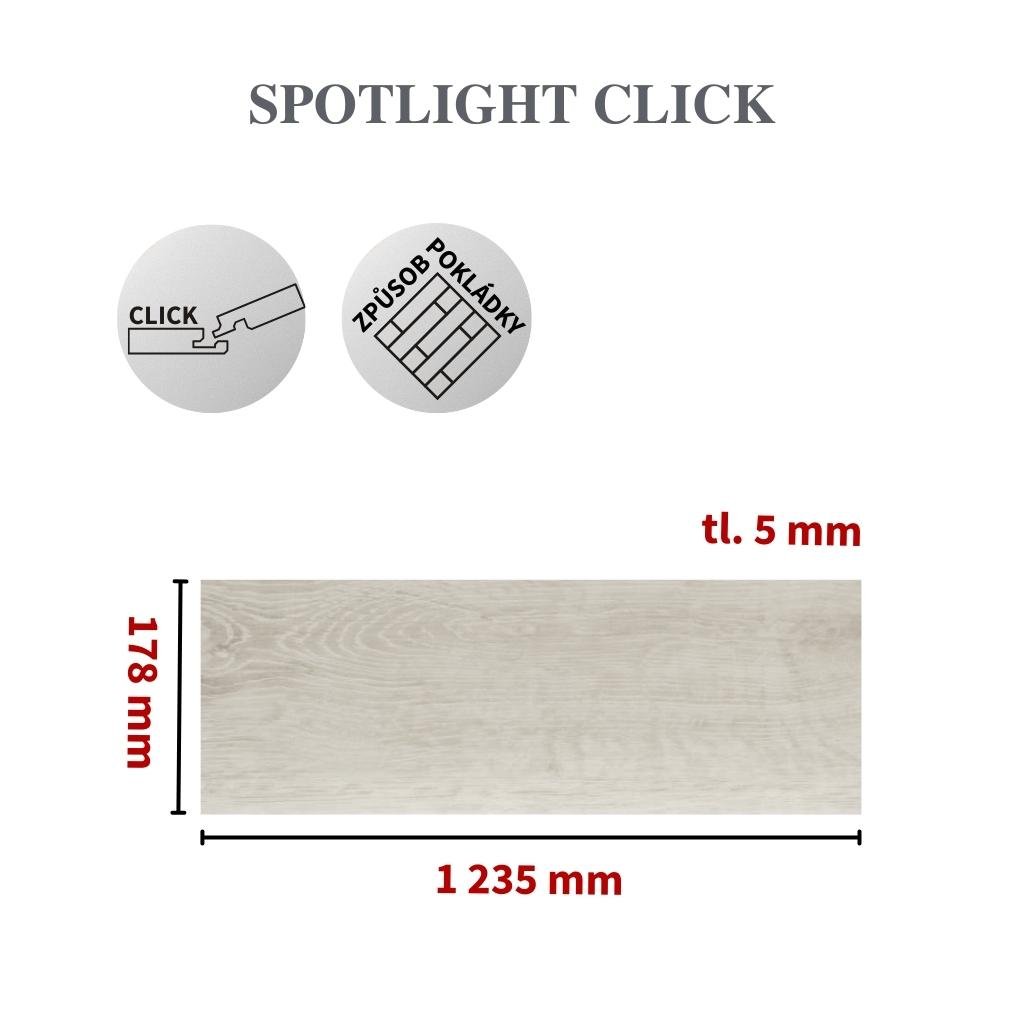 Kolekce Spotlight nabízí devět moderních dekorů s realistickým vzhledem dřeva. Mikro V-spára na všech čtyřech stranách lamely umocňuje přirozený dojem dřevěné podlahy.