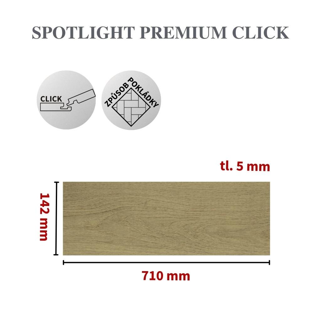 Vinylová podlaha Spotlight Premium spojuje moderní design s vysokou odolností a snadnou údržbou. Dostupná je jak ve variantě Click (rychlá pokládka bez lepení) tak v lepeném provedení (maximálně stabilní).